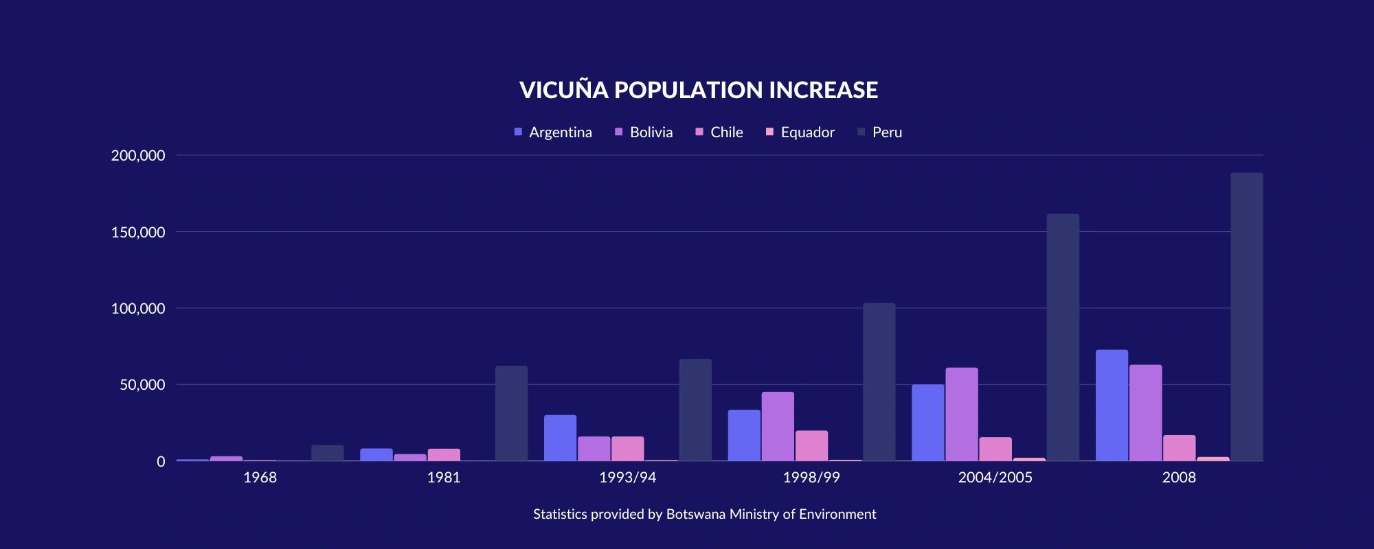 With the national and international trade ban enforced and a period of absolute protection fully implemented, vicuña populations recovered. During the strict regime of trade prohibition, vicuña populations across all five countries increased by 789% (1969-1993/94).